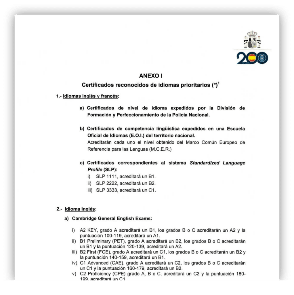 Podrás comprobar que existen 2 anexos: el primero nos enumera los certificados reconocidos de idiomas prioritarios y el segundo los certificados de idiomas de interés policial.