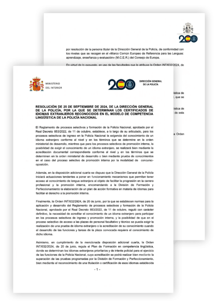 Nos vamos a ir a la Resolución de 25 de septiembre de 2024, de la Dirección General de la Policía, por la que se determinan los certificados de idiomas extranjeros reconocidos en el modelo de competencia lingüística de la Policía Nacional...