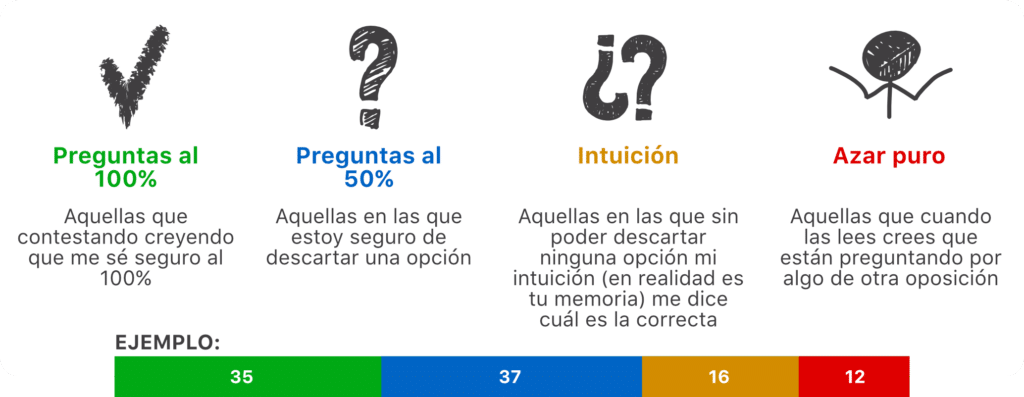 El siguiente paso que es un cinturón naranja que ya es un salto importante es comenzar a repasar aquello que hemos fallado, a medida que seguimos progresando, comenzamos a pensar en la estadística y podemos pasar al siguiente estadio que es el cinturón verde o azul y es contestar las 100 preguntas «porque estadísticamente nos beneficia», pero lo que realmente marca la diferencia es el cinturón negro, que es aprender por qué estamos contestando, saber qué tipo de respuestas damos, nuestra tasa de error, la media de esta, su correlación con las notas de corte y con las de nuestros competidores, y en una oposición que se aprueba con un cinco marca la diferencia, pero en una oposición que sólo se aprueba estando entre los mejores, la diferencia es vital, es de apto o no apto.