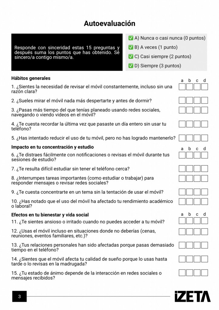 ✅ Impacto en tu rendimiento: Datos respaldados por estudios científicos sobre cómo el móvil afecta la concentración, el aprendizaje y el descanso.